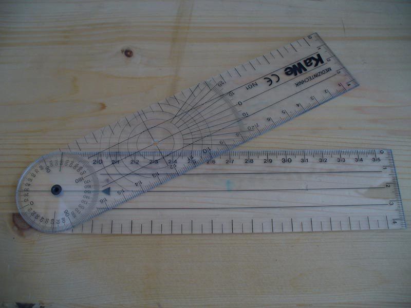 Klasický plastový goniometer používaný vo fyzioterapii.